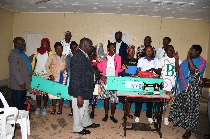 Groups received an assortment of tools including a fully equipped motorcycle repair toolbox, sewing machines, finishing machines, stitching hooks, scissors, leather materials, layers, micro soles, gum, threads, rivets, shoe laces, knitting machines, and tailoring machines collectively valued at over UGX 10 million.